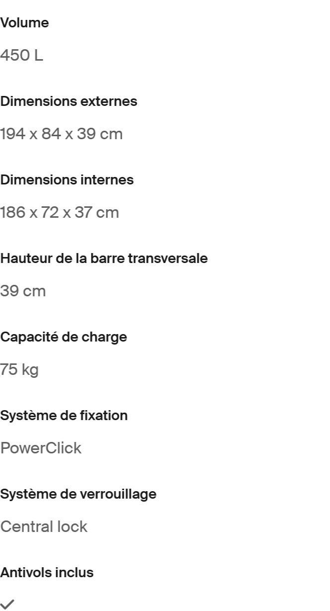 Avec 450 litres d'espace de chargement et une limite de poids de 75 kg, Thule Pulse 2 est prêt pour tout, des équipements sportifs aux bagages de week-end. Sa coque durable et bien conçue s'adapte à une large gamme de véhicules tout en conservant un profil prore et moderne.